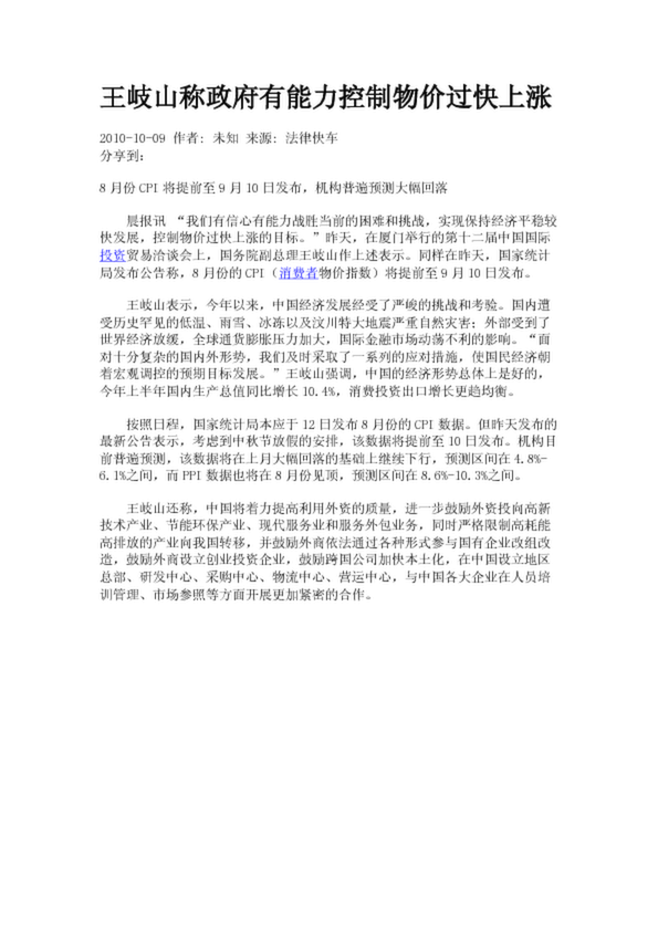 王岐山稱政府有能力控制物價過快上漲