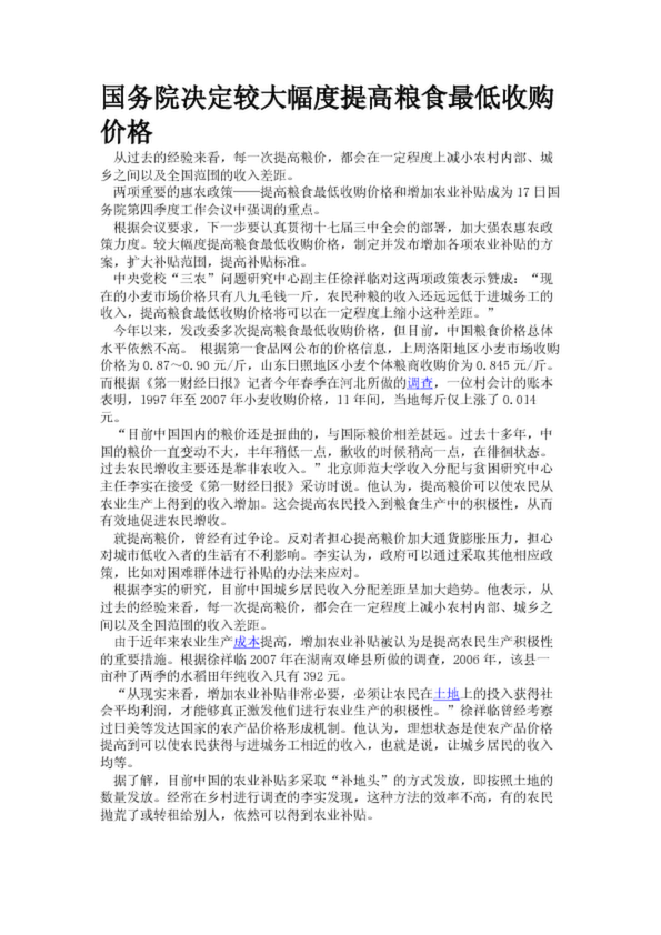 國務(wù)院決定較大幅度提高糧食最低收購價格