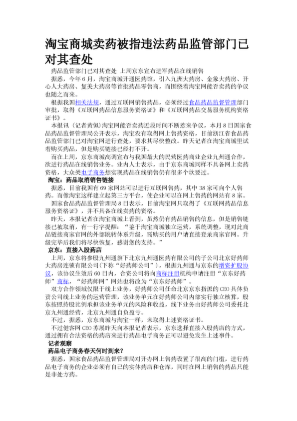 淘寶商城賣藥被指違法藥品監(jiān)管部門已對(duì)其查處