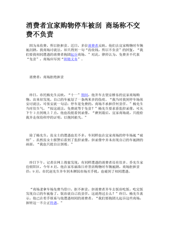 消費(fèi)者宜家購(gòu)物停車被刮 商場(chǎng)稱不交費(fèi)不負(fù)責(zé)(24.54KB)