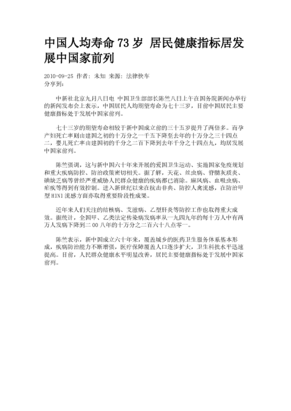 中國人均壽命73歲 居民健康指標居發(fā)展中國家前列