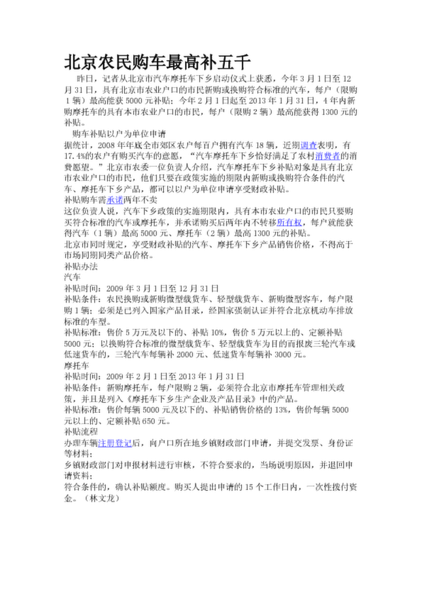 北京農民購車最高補五千