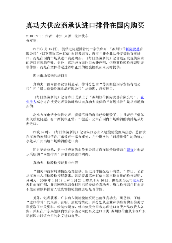 真功夫供應商承認進口排骨在國內(nèi)購買