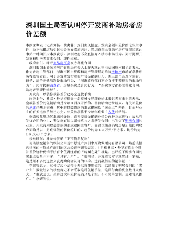 深圳國(guó)土局否認(rèn)叫停開發(fā)商補(bǔ)購(gòu)房者房?jī)r(jià)差額