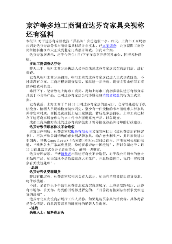 京滬等多地工商調(diào)查達(dá)芬奇家具央視稱還有猛料