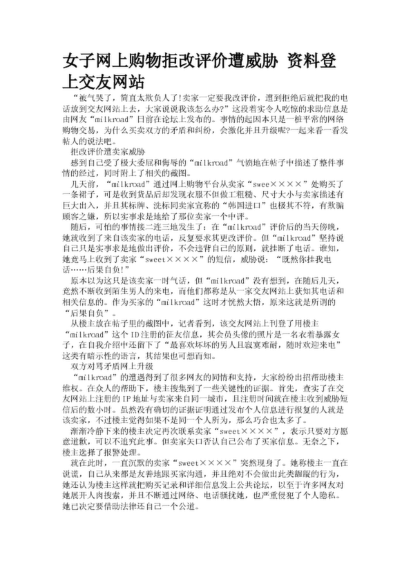 女子網(wǎng)上購(gòu)物拒改評(píng)價(jià)遭威脅 資料登上交友網(wǎng)站