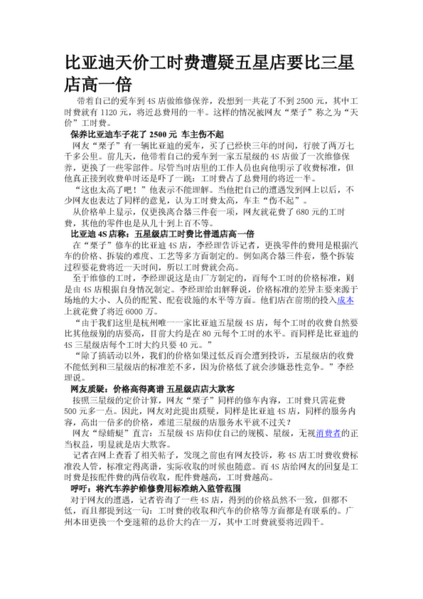 比亞迪天價工時費遭疑五星店要比三星店高一倍