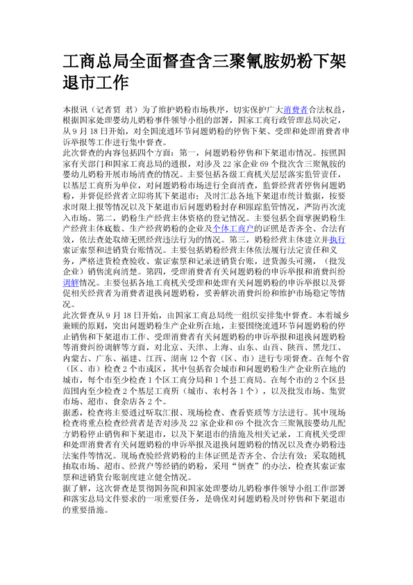 工商總局全面督查含三聚氰胺奶粉下架退市工作
