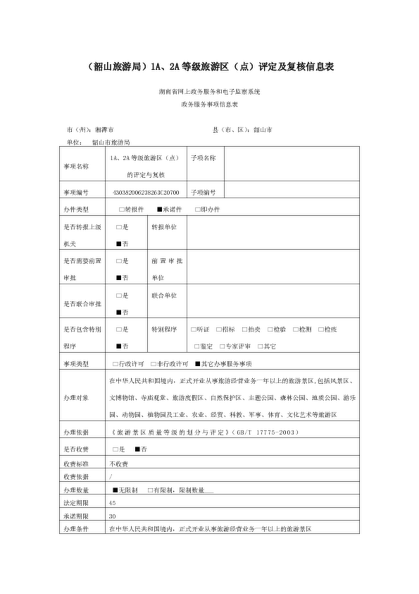 (韶山旅游局)1A、2A等級旅游區(qū)(點)評定及復核信息表