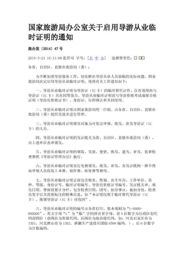 國(guó)家旅游局辦公室關(guān)于啟用導(dǎo)游從業(yè)臨時(shí)證明的通知(3.89KB)