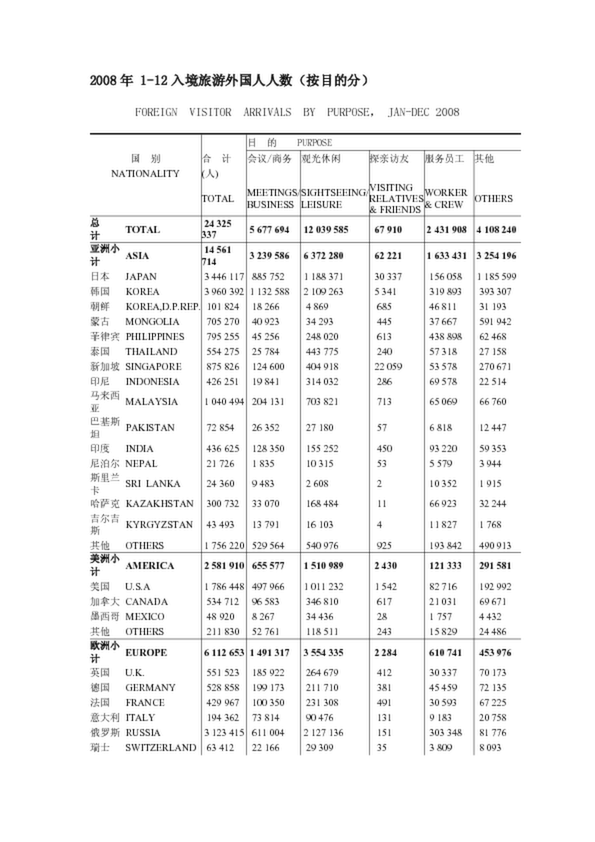 2008年 1-12入境旅游外國(guó)人人數(shù)(按目的分)的數(shù)據(jù)報(bào)告