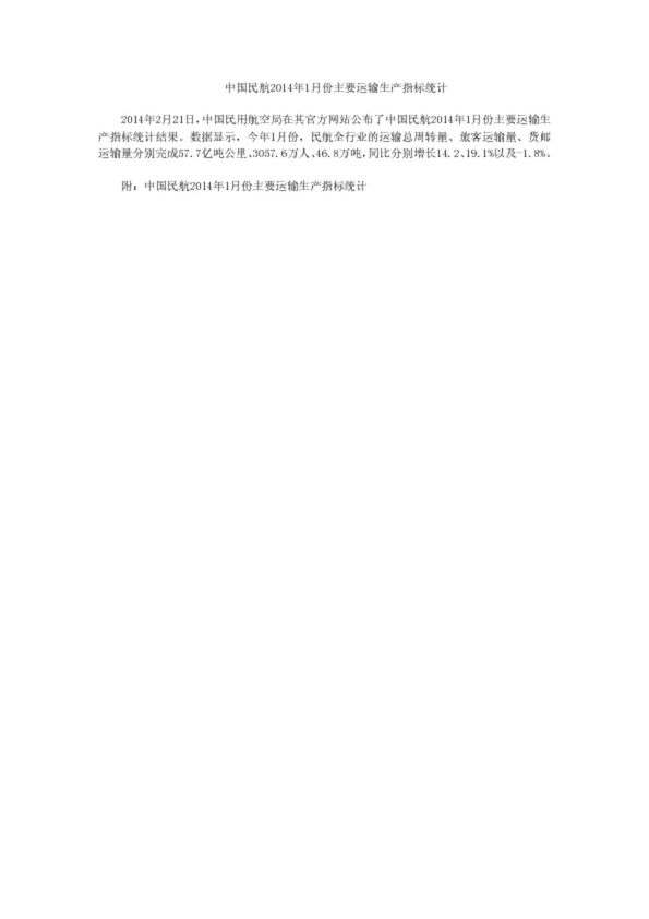 中國(guó)民航2014年1月份主要運(yùn)輸生產(chǎn)指標(biāo)統(tǒng)計(jì)(0.43MB)