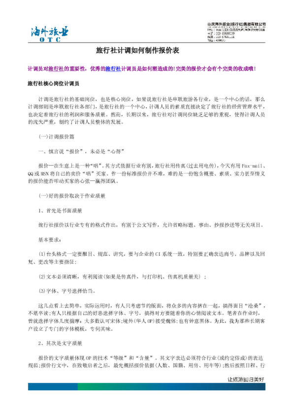 旅行社計調(diào)如何制作報價表,與各家同業(yè)旅行社聯(lián)系,經(jīng)常用電腦向同業(yè)旅行社要最新的報價和行程,向同業(yè)的旅行社問清楚各家的線路的具體行程安排,包括餐標(biāo)、住宿條件、旅游車信息、往返交通時間…………許多細(xì)枝末節(jié)的事情