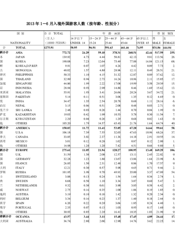 2013年1-6月入境外國(guó)游客人數(shù)(按年齡、性別分)