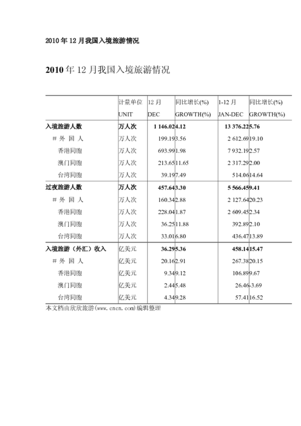 2010年12月我國入境旅游情況