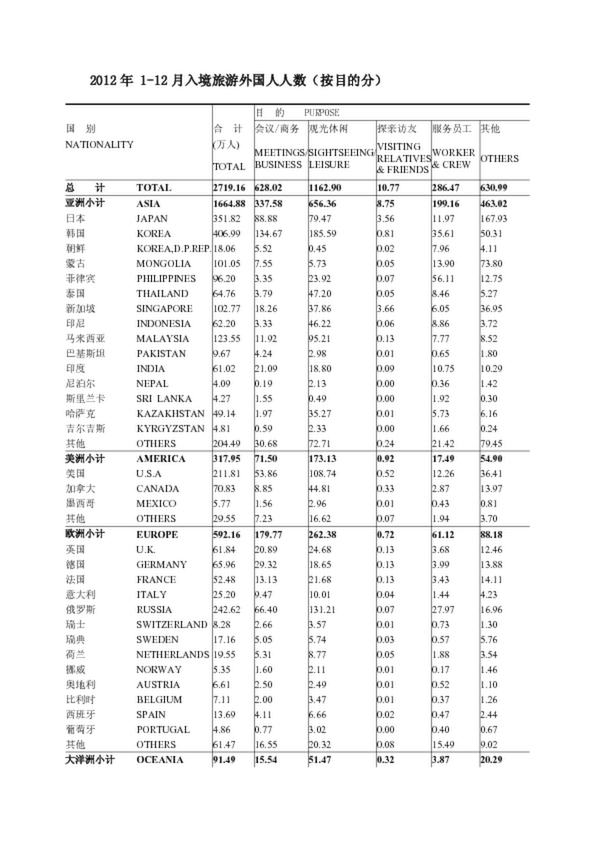 2012年 1-12月入境旅游外國(guó)人人數(shù)(按目的分)