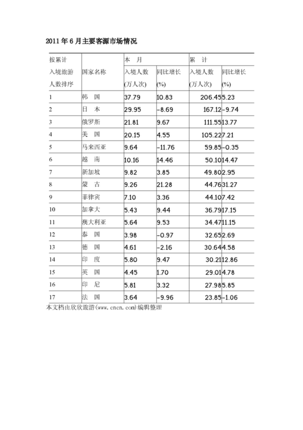 2011年6月主要客源市場(chǎng)情況