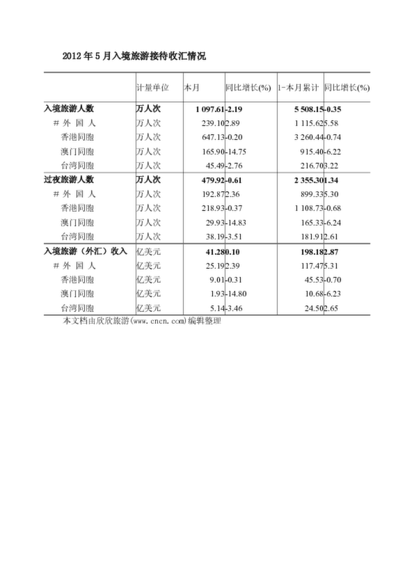 2012年5月入境旅游接待收匯情況