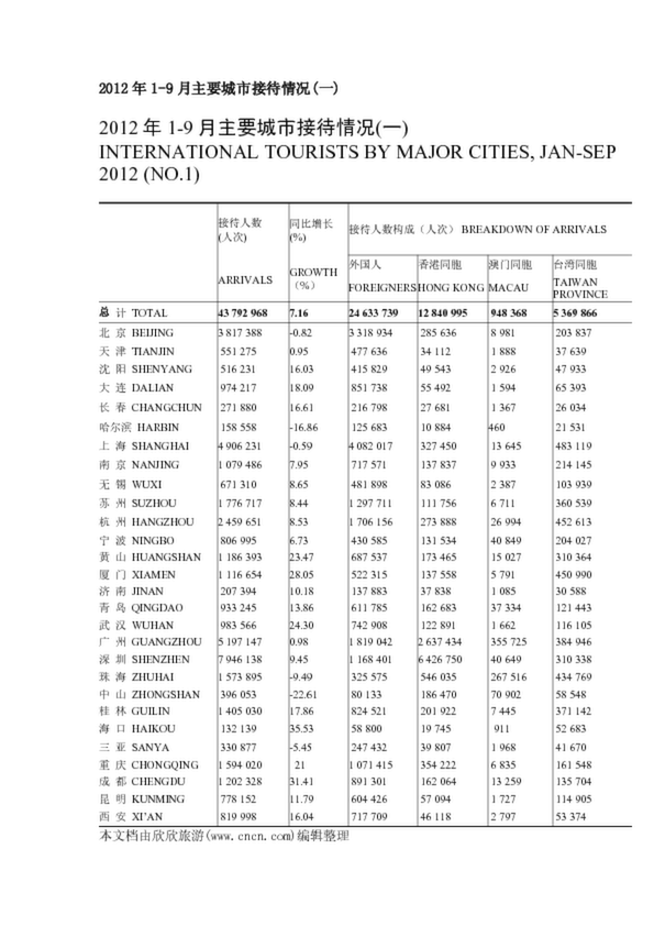 2012年1-9月主要城市接待情況(一)