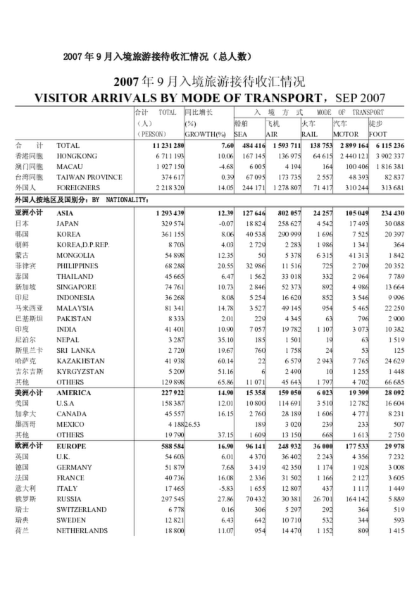 2007年9月入境旅游接待收匯情況(總人數(shù))