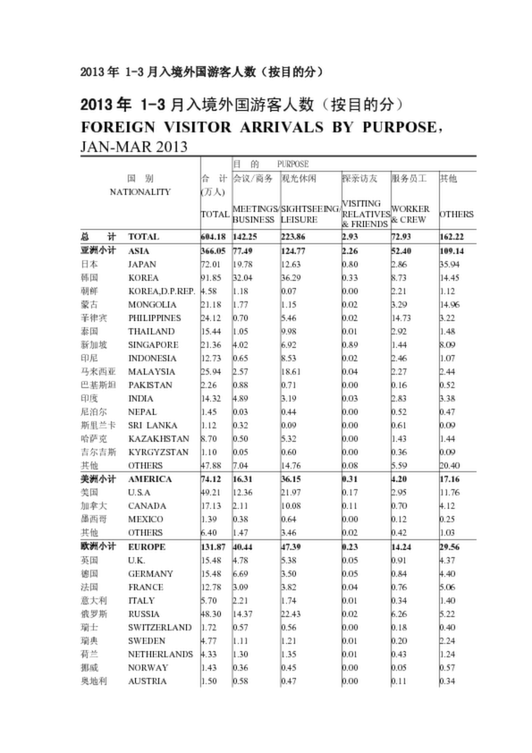 2013年 1-3月入境外國游客人數(shù)(按目的分)