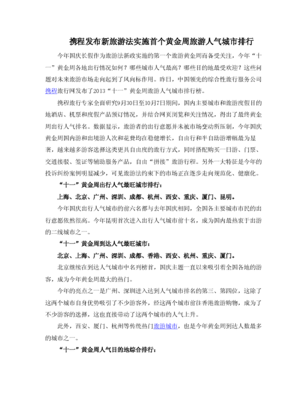 攜程發(fā)布新旅游法實(shí)施首個(gè)黃金周旅游人氣城市排行