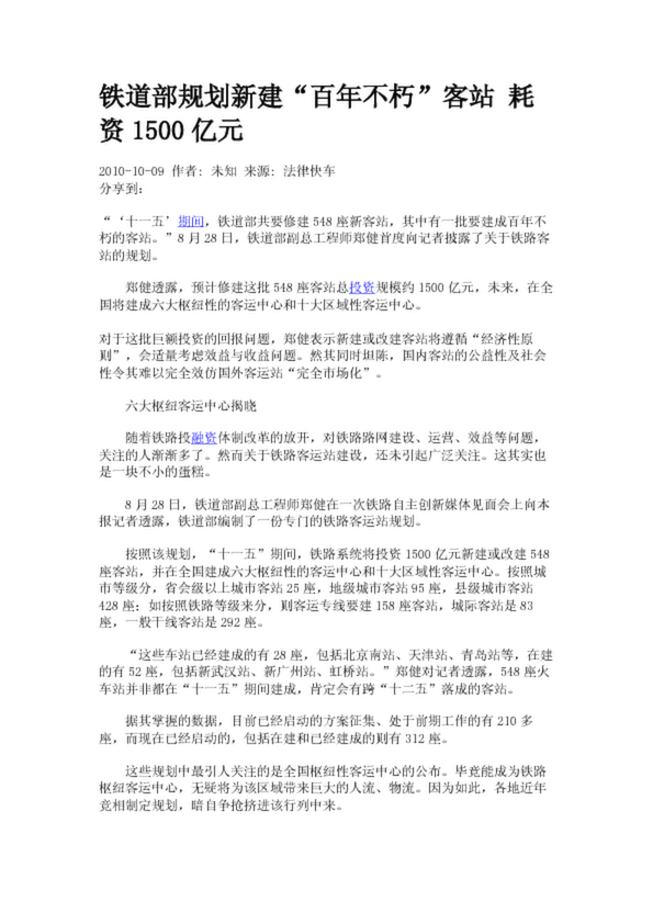 鐵道部規(guī)劃新建“百年不朽”客站 耗資1500億元