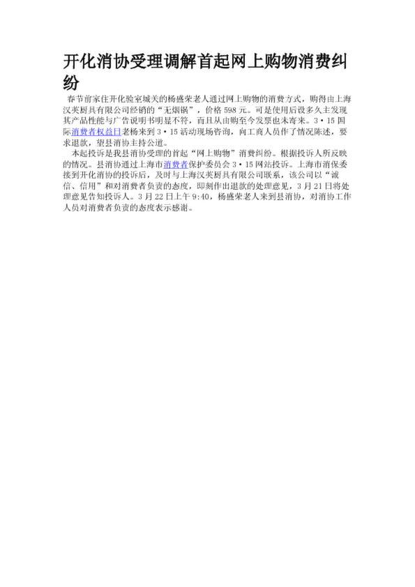 開(kāi)化消協(xié)受理調(diào)解首起網(wǎng)上購(gòu)物消費(fèi)糾紛(16.64KB)