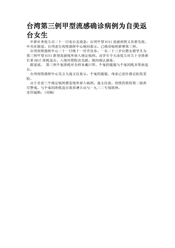 臺灣第三例甲型流感確診病例為自美返臺女生