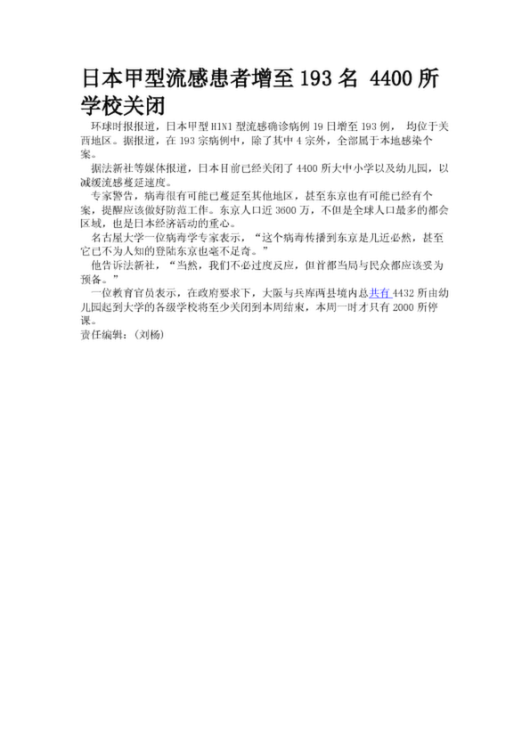 日本甲型流感患者增至193名 4400所學(xué)校關(guān)閉