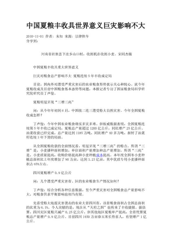 中國夏糧豐收具世界意義巨災(zāi)影響不大