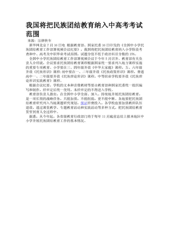 我國將把民族團結教育納入中高考考試范圍